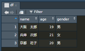 行数3 (3人分のデータ),列数3(name,age,genderの3つのベクトル)のデータフレームが作成されたことが確認できる。