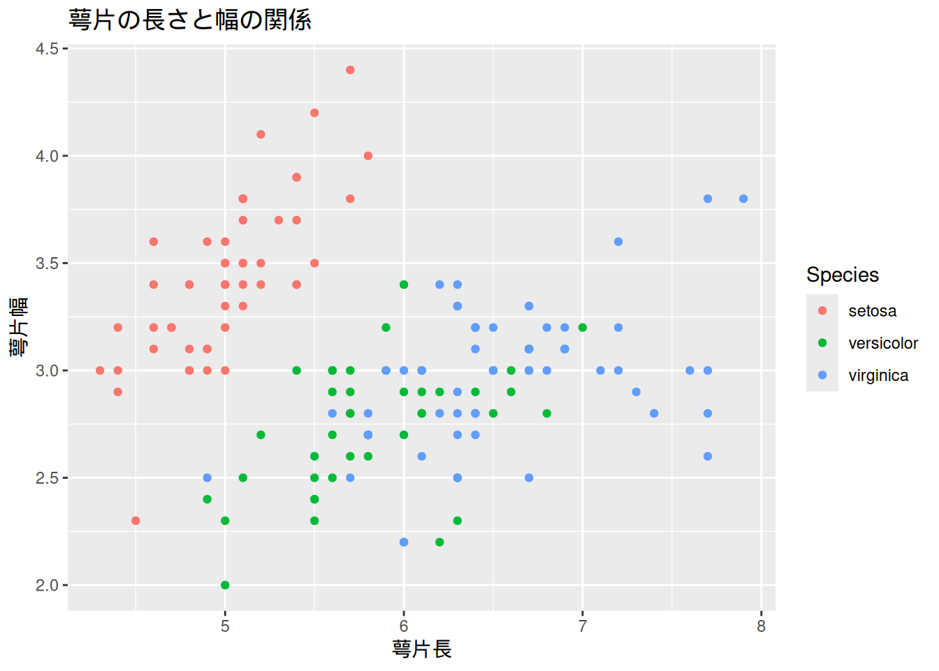 散布図も,アヤメの種類ごとに色分けして描くことができる。色分けを行うには,aes()のcolorでファクター型変数を指定すれば良い。この場合は,Speciesによって点の色を変えるので,以下のように書く。