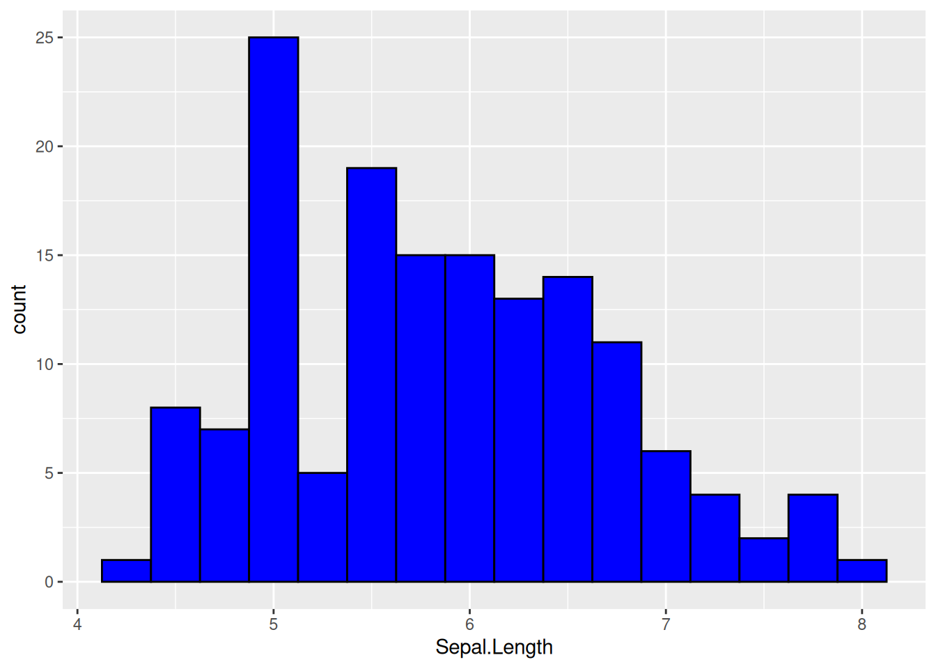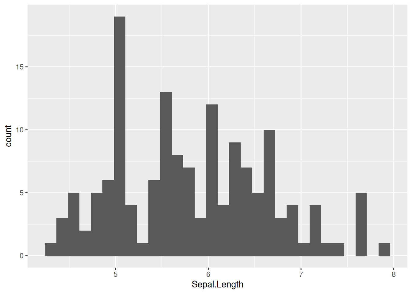 ここでは,gというオブジェクトにグラフの素地を作成している。ggplot()関数の振舞いを理解するのは簡単ではないが,まずは決まったやり方を覚えよう。ggplot()関数を使うときには,まずデータフレームと,x軸,y軸にとる変数などをaes()で指定しグラフの素地を作成する。ここではggplot()関数にパイプでデータフレームirisを渡し,aes()でグラフのx軸に用いる変数Sepal.Lengthを指定している。ヒストグラムの場合に最低限必要なのは,x軸の変数(ヒストグラムを作成する変数)だけである。