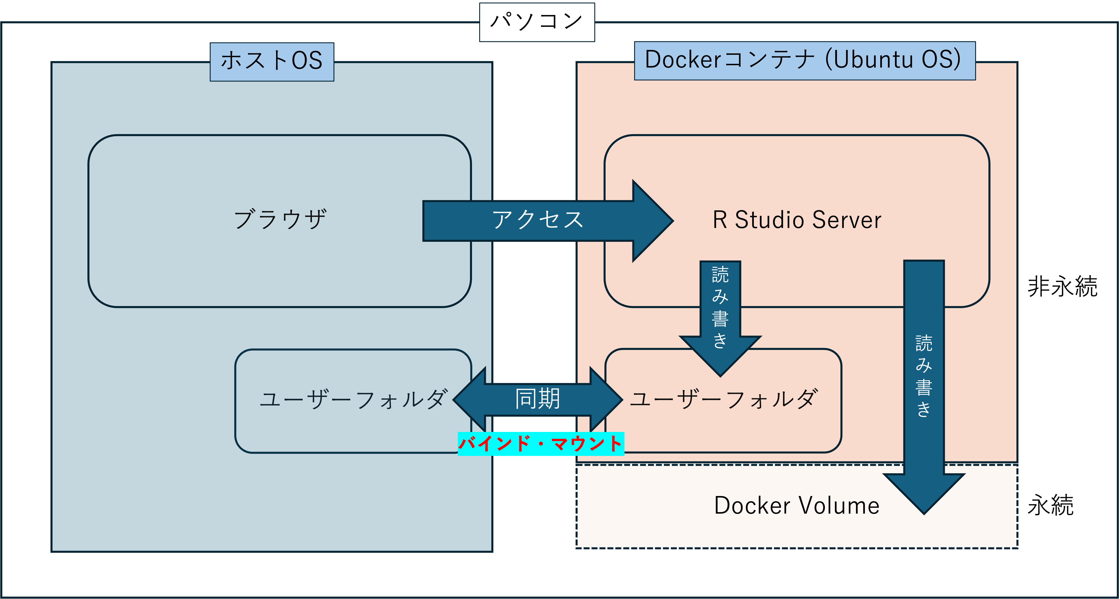 ホスト側のフォルダをマウントする方法をバインド・マウントといい,ホスト側のフォルダとコンテナ側のフォルダが同期されるので,コンテナから直接ホスト側のフォルダにアクセスしているのと同じ操作感になる。