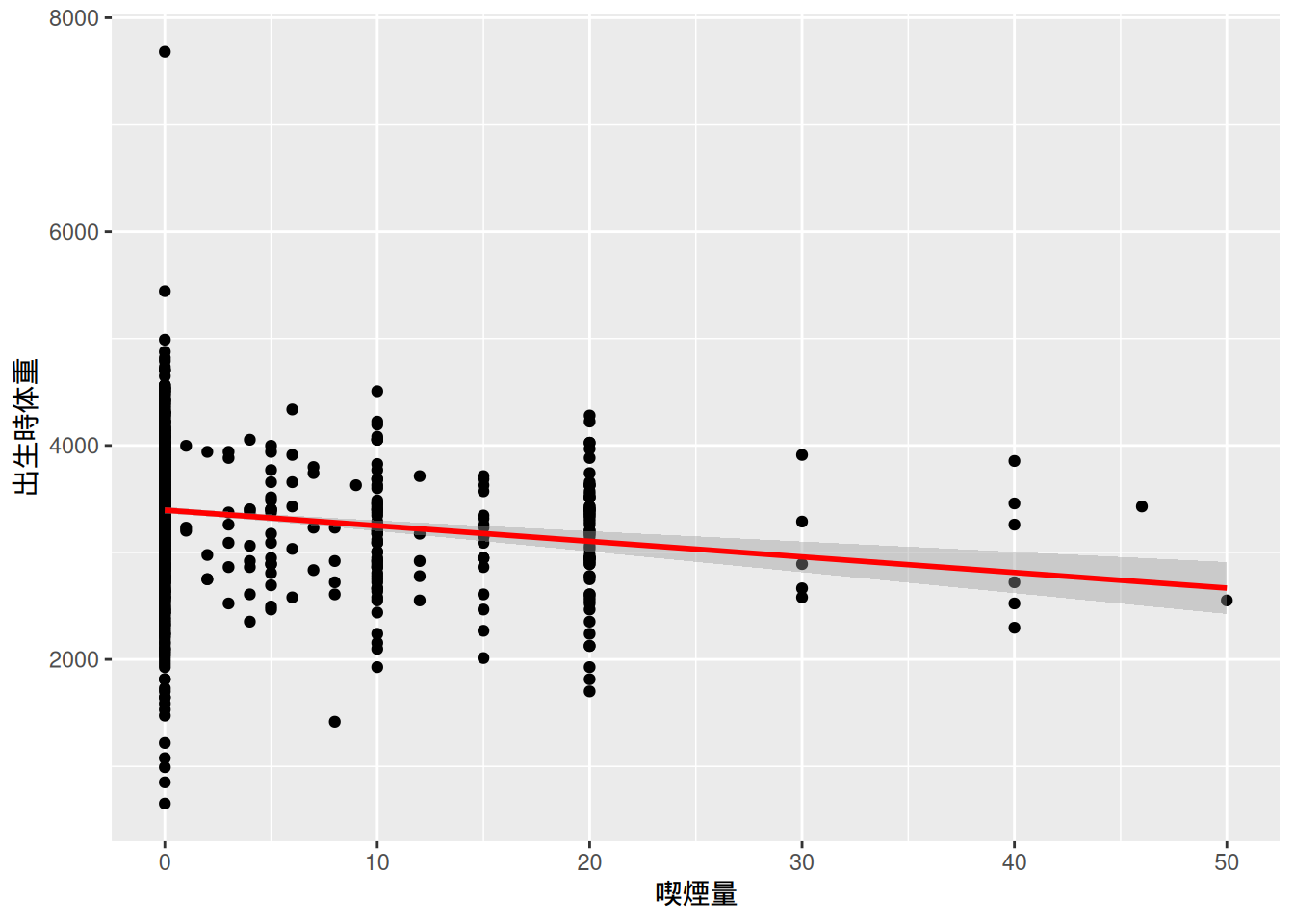 - 他の要因を一定として,母親の1日の喫煙量が1本増加すれば,新生児の出生時体重は14グラム減少する