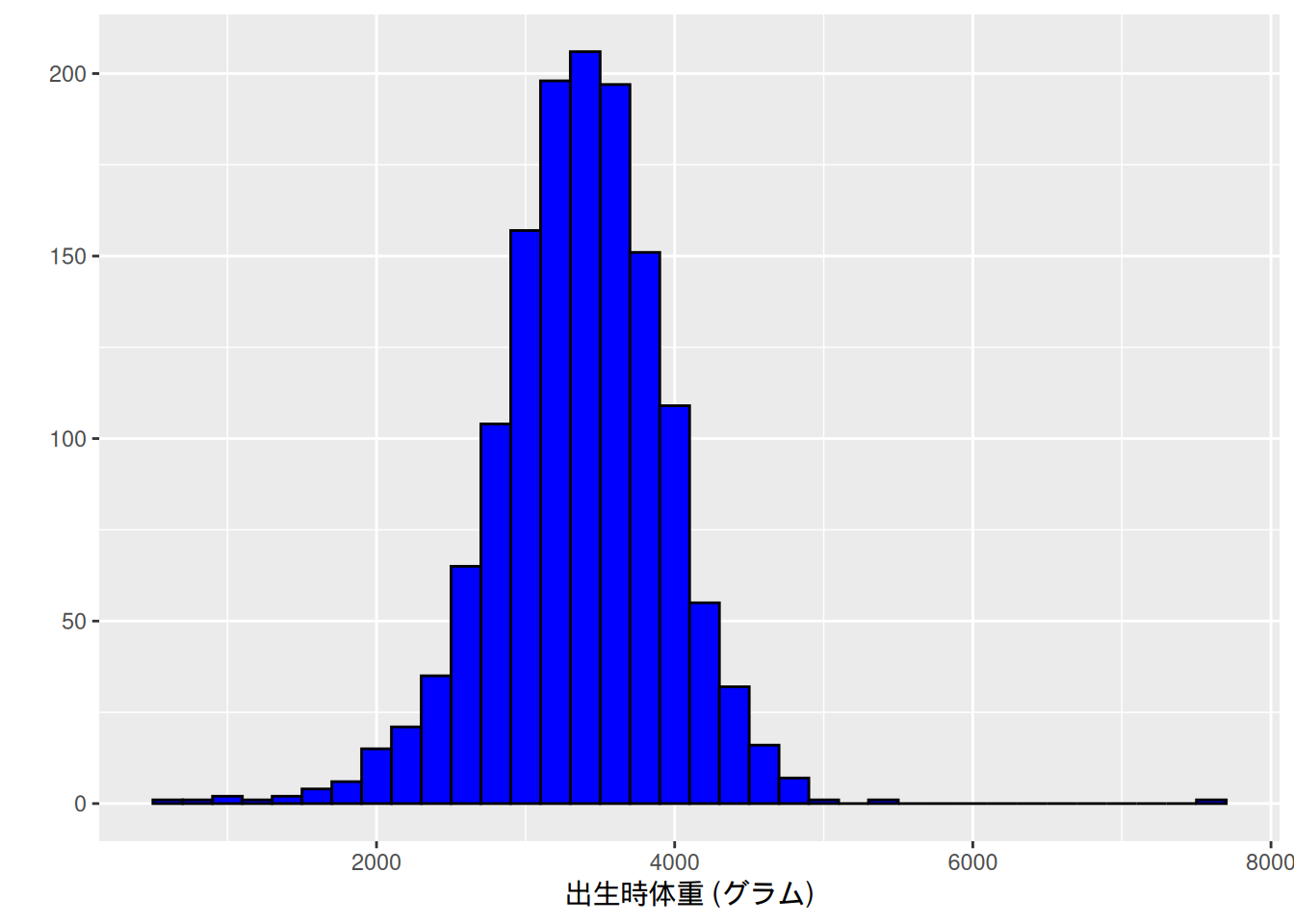 このデータでは,新生児の出生時体重はオンスという単位で記録されている。しかし,オンスという単位にはあまり馴染みがないと思うので,これをグラムに変換しておこう。1オンスは28.3495グラムなので,以下のように新しい変数bwghtgramを作成する。